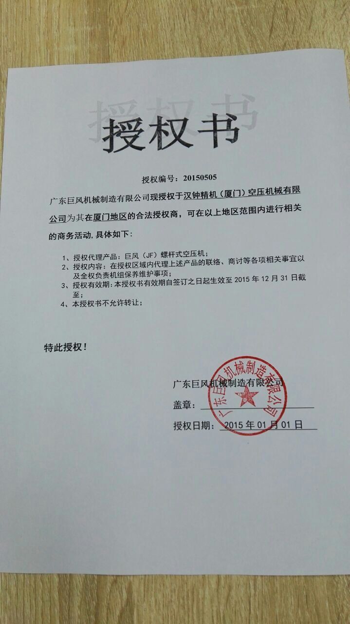 2013年8月福建建阳长风授权厦门汉钟精机有限公司----总代理经销权
